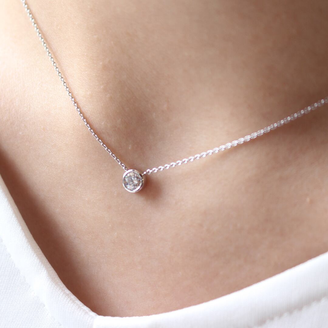 ベゼルセッティングは実際より大きく見え、さらに3EXなので存在感はかなりあります。2個目のダイヤネックレスとしてもおすすめです。