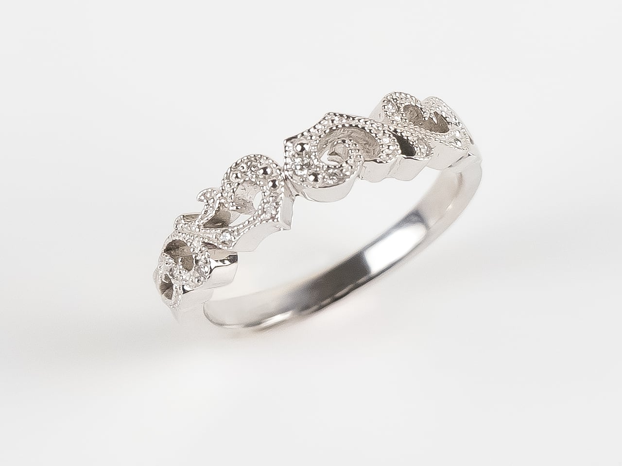 全体的にミル打ちと言われるアンティーク調の模様を入れダイヤのキラキラだけではない